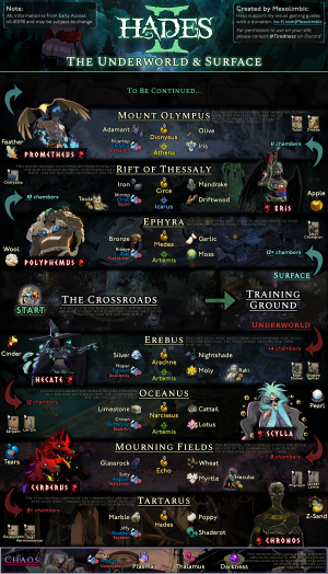 Hades II have multiple locations that can be explored. When Melinoë goes on another run she will go through Regions. Each Region has its own set of Enemies, Resources, Bosses and special Encounters. Region consists of several Locations, and ends with a Boss fight. Between the Regions Melinoë gets to a special Location where she can recover
